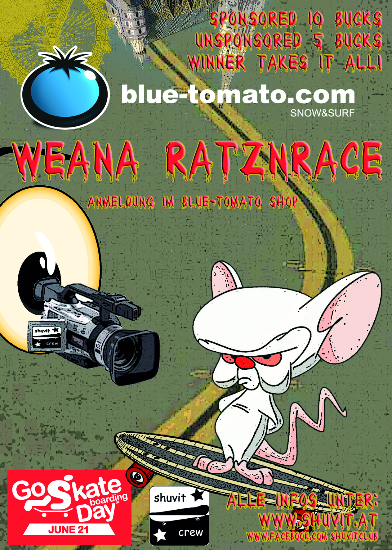 UPDATE vom Mi., 21.September 2011: Es war lange Zeit still um den Video-Contest von Bluetomato & der Shuvit Crew. Aber jetz werden Nägel mit Köpfen gemacht! Bis kommenden Montag (26.09.2011) gilt die letztmalige Verlängerung des „Vienna Rat Race“. Dann werden am Abend im Bluetomato Shop Wien, alle Videos gesichtet und die Gewinner gekürt. Wer also noch mitmachen will, kann seine Video-Schnipselei auf CD / DVD / USB-Stick mitbringen und in den Teilnehmer-Topf werfen. Selbstredend, dass wir dabei auf ein chilliges Umfeld achten und Euch natürlich mit Getränken & Snacks verköstigen. Dreht einfach ein Skate-Video, bei dem klar erkennbar der Fun am Sk8boarding zum Ausdruck gebracht wird und kommt damit in den Bluetomato Shop. Es lohnt sich! C ya…