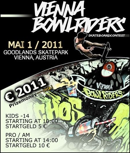 Und die Korken knallen dann anschliessend am Sonntag, dem „Tag der Arbeit“ – am 01.Mai 2011 ist wieder „Vienna Bowlriders“ Championship in Hütteldorf auf dem Plan angeschrieben. Wer bei einem der letzten Male dabei war, wird es sich nicht nehmen lassen wieder vorbei zu schauen wenn Österreichs Top-BowlRider sich, um ein Preisgeld in Höhe von 2011,-€ zu ergattern, in die „Salatschüssel“ werfen. Also wir sind auf jeden Fall wieder mit von der Partie & hoffentlich seid Ihr es auch, dann kann der Sommeranfang voll motiviert gemeinsam gefeiert werden !!!