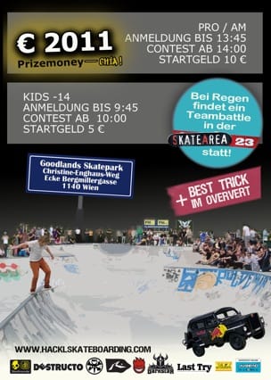 Roman Hackl startet zu Ostern seine Contest-Offensive und beendet damit gleichzeitig die Wintersaison der SkateArea23. Ostermontag und den darauf folgenden Dienstag wird es in der Halle Contests für den Nachwuchs geben. Geplant sind ein Street-Contest & ein Bowl-Spektakel bei dem sich die Kids einiges an Preisen abholen können. Am „Tag der Arbeit“, dem 1.Mai, dann fast schon traditionell die „Vienna Bowlriders 2011“ in der Schüssel in Hütteldorf. Auch dieses Jahr lockt ein üppiges Preisgeld, dass garantiert auch wieder eine grosse Anzahl auswärtiger Brettl-Fanatiker nach Wien lockt. Zurückblickend auf die vergangenen Jahre, dürfen wir uns sicher wieder auf massive Action freuen. Also, Terminkalender raus & rot anstreichen !