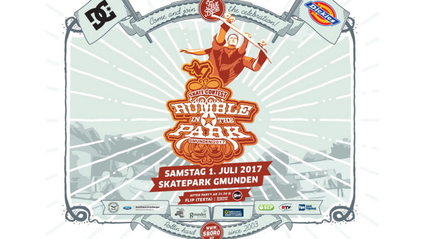 Am Samstag, den 1. Juli 2017, ist es wieder soweit und der 13. DC Rumble in the Park powered by Dickies geht im neu gestalteten Skatepark von Gmunden über die Bühne. Im letzten Jahr konnte aus organisatorischen leider kein Rumble ausgerichtet werden. Um so größer ist die Vorfreude auf den diesjährigen Event! Taditioneller Weise wird es wieder den Street-Event und die Bowl-Session geben, sowie getrennte Wertungen für Amateure und Pro’s. Für die Pro’s stehen insgesamt 1.500,- Euro Preisgelder parat und für die Amateure gibt es Sachpreise im Wert von sagenhaften 3.000,- Euros! Nicht zu vergessen die begehrten Keramiktrophäen! Wie immer hat Chef-Organisator Michi Nadler mit seinem 5Boro Store alle Hebel in Bewegung gesetzt um einen perfekten Event auf die Beine zu stellen. Es gibt auch alle Info’s auf der 5Boro Homepage zu finden, sowie auch auf Facebook.