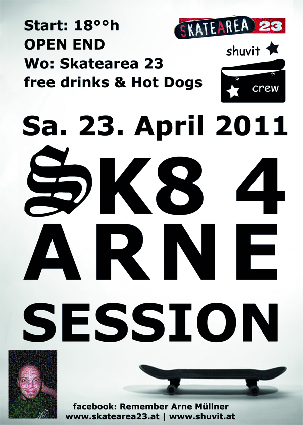Wir rufen alle denen Skateboarding unter die Haut geht dazu auf, mit uns gemeinsam am Samstag,d. 23.04. unserem Freund Arne Müllner bei einer chilligen BBQ-Sk8-Session zu gedenken. Arne verstarb im letzten Jahr auf tragische Weise und wurde seiner Familie und seinen Freunden viel zu früh entrissen. Jeder der Arne kannte wird Euch gerne bestätigen mit wieviel Herzblut er Skateboarding lebte. Seine Skillz sprachen Bände!