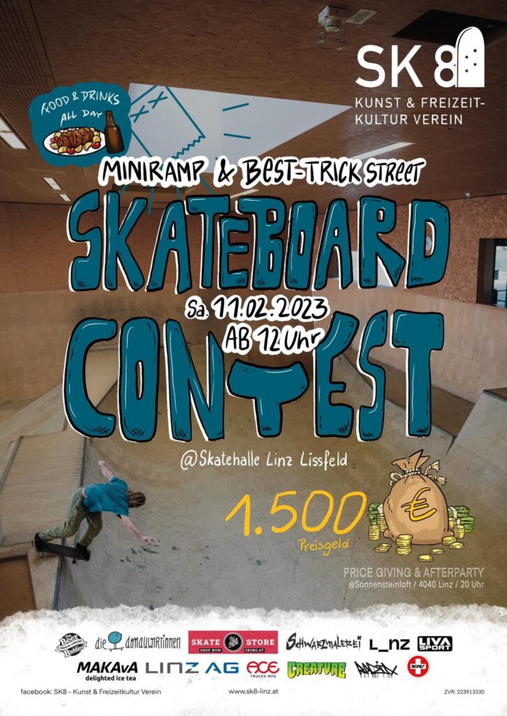Am kommenden Samstag, den 11. Feber 2023 findet in der Linzer Skatehalle in Lissfeld ein Skatecontest statt. Infos zur Skatehalle findet man hier! Es wird zwei Kategorien geben, einmal eine Miniramp Contest und eine Best-Trick Session im Street-Bereich. Die Skatehalle Lissfeld ist am Hausleitnerweg 105, 4020 Linz zu finden. Der Veranstalter ist der Linzer Verein SK8 – Kunst & Freizeitkultur.