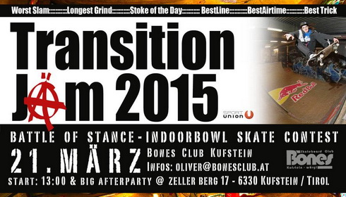 Am kommenden Samstag, den 21. März 2015, geht der legendäre und allseits beliebte Indoor-Bowl-Contest Transition Jäm in der Kufsteiner Skatehalle des Skateboardclub Bones ab. Die …